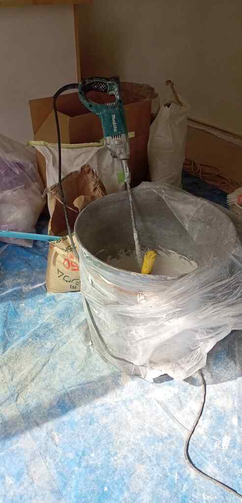 下地の材料はペースト状なのですが、漆喰が引っかかるように寒水石と言う砂のようなものを混ぜ込みます。